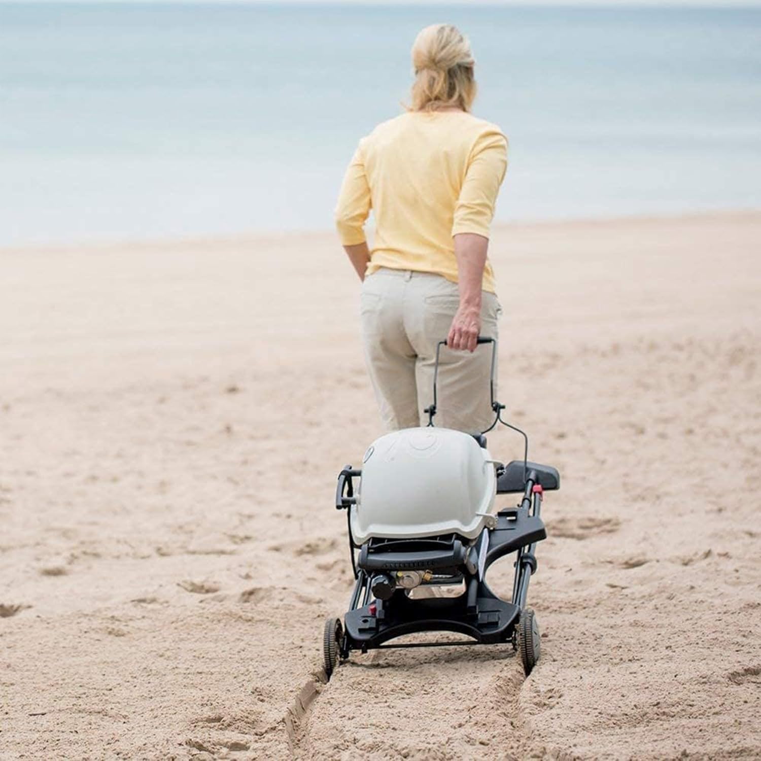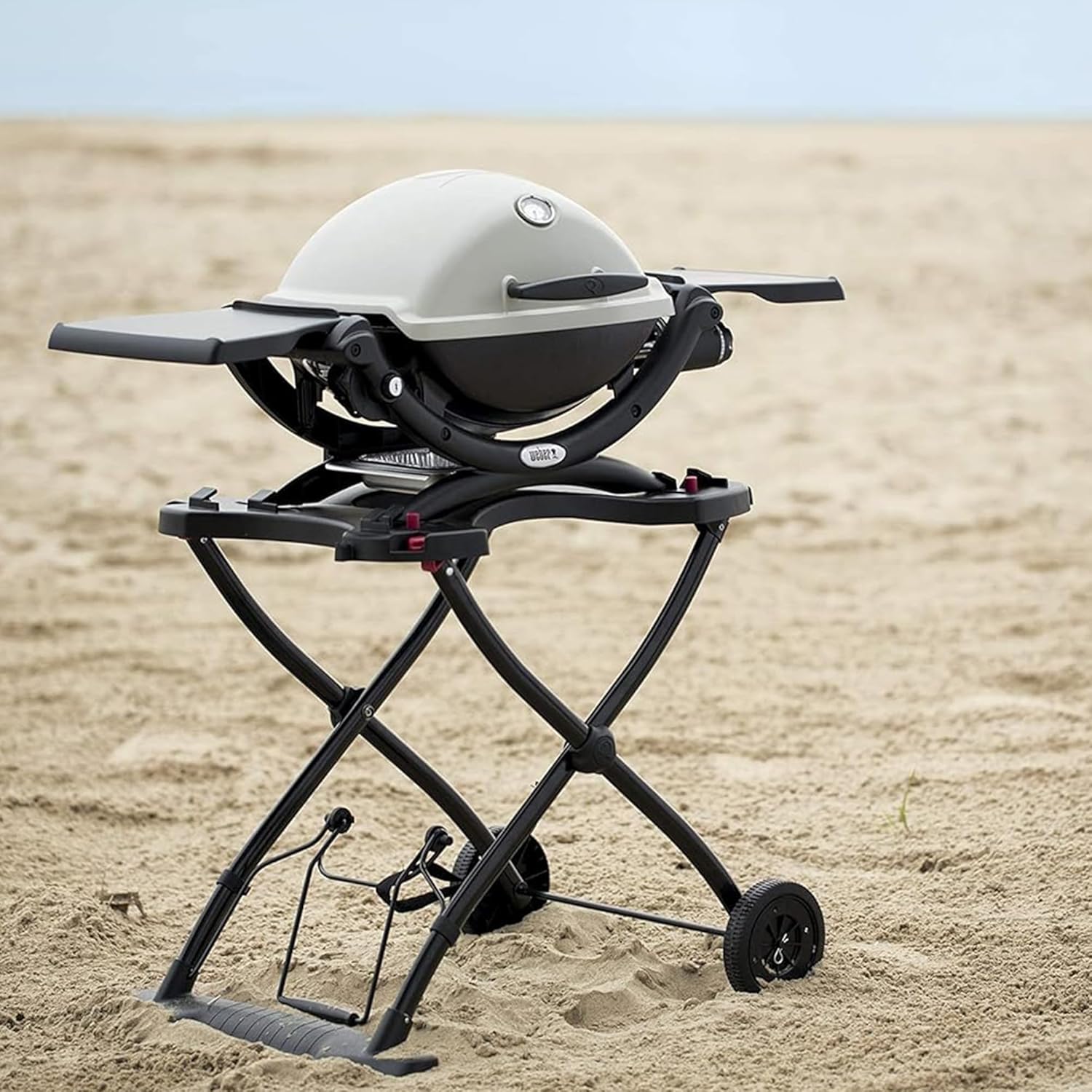 Grill beyond your patio. The Portable Cart is designed to make grilling on-the-go as easy as flipping a burger. Place your Q grill onto the cart and use it as a stationary stand that sits at the optimal grilling height. When ready to take your grilling adventures on the road, simply fold it down and roll it to your car or straight to the beach.