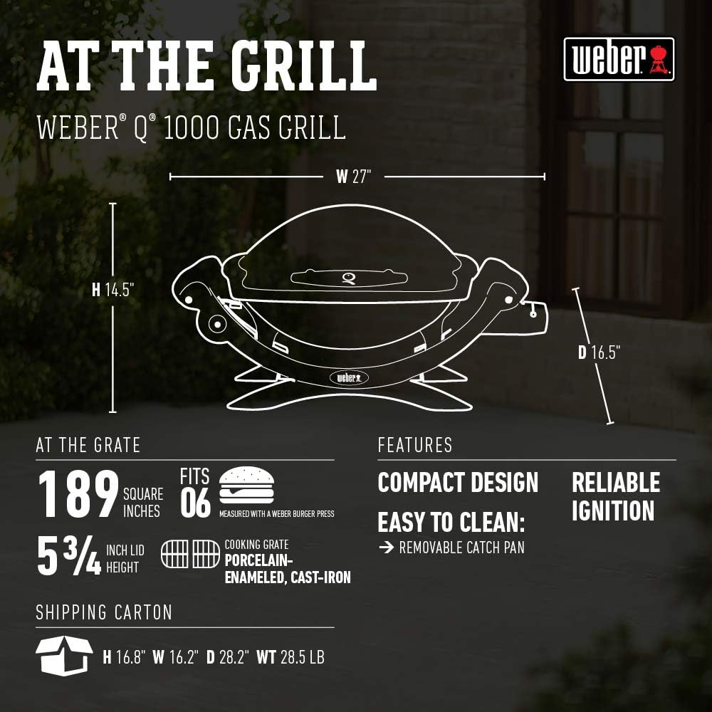 Restyled for 2014, the Weber Q 100 is now the Weber Q 1000. The grill has the same great performance and sleek styling, but adds new aesthetics that are both functional and fun, including larger grip handle and control knobs, ergonomic side handles, sturdy front and rear cradles plus the familiar Weber Q logo branded in the lid. Split grates allow for a grate/griddle cooking combination: Just replace one of the grates with the Q 1000-series compatible griddle (sold separately) and experience a delicious alternative way of preparing breakfast, lunch and dinner on your grill. Durable, but lightweight, cast-aluminum construction of the Weber Q 1000 makes this super-portable grill the perfect tailgating companion. Used on the go, it runs on disposable LP cylinders (not included), but can be a stationary a stay-at-home grill also. An optional LP adapter hose for hook up to a 20-lb. tank is available as an accessory. Reliable starts are assured with the simple-to-operate push-button ignition. Burgers, brats and dogs are easily handled, but a large variety of other foods may also be cooked at any temperatures from low to high. Just dial-in the proper heat setting by adjusting the infinite control burner valve. May be used with Weber Portable Cart model #6557.